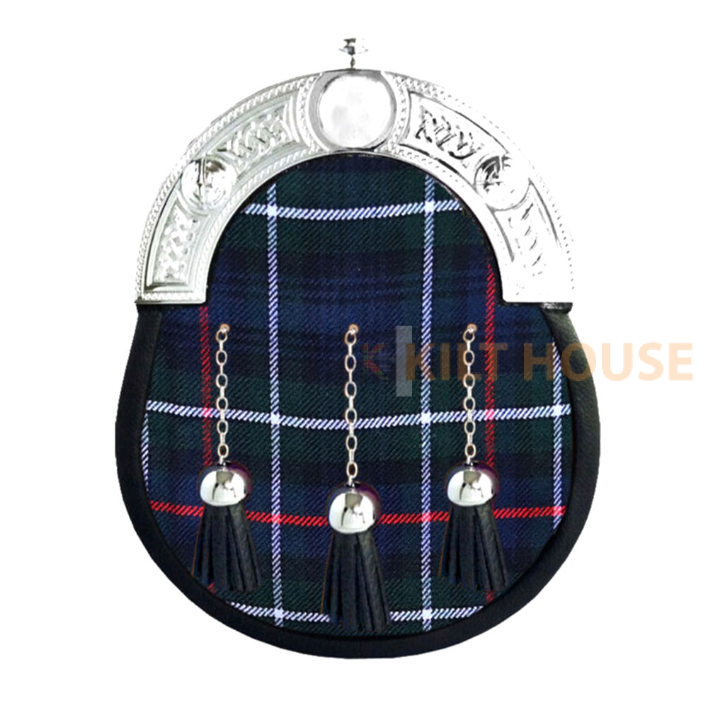 Mackenzie Tartan Full Dress Leather Sporrans Introducing the Scottish Kilts Outfit Sporran, crafted from 100% genuine leather with a Celtic silver cantle and chain strap. This traditional Wallace Tartan kilt sporran bag embodies Scottish heritage and clan pride. The Black Watch Tartan Sporran is available in full-dress leather, featuring a customizable clan tartan on the front with three matching leather tassels. Made to order, this sporran combines premium-grade leather with a classic Scottish design, offering both value and durability. It’s an ideal accessory for both formal and informal events, perfect for those seeking quality and affordability.