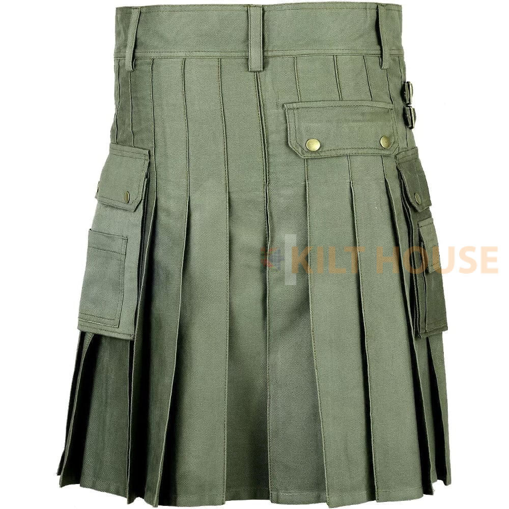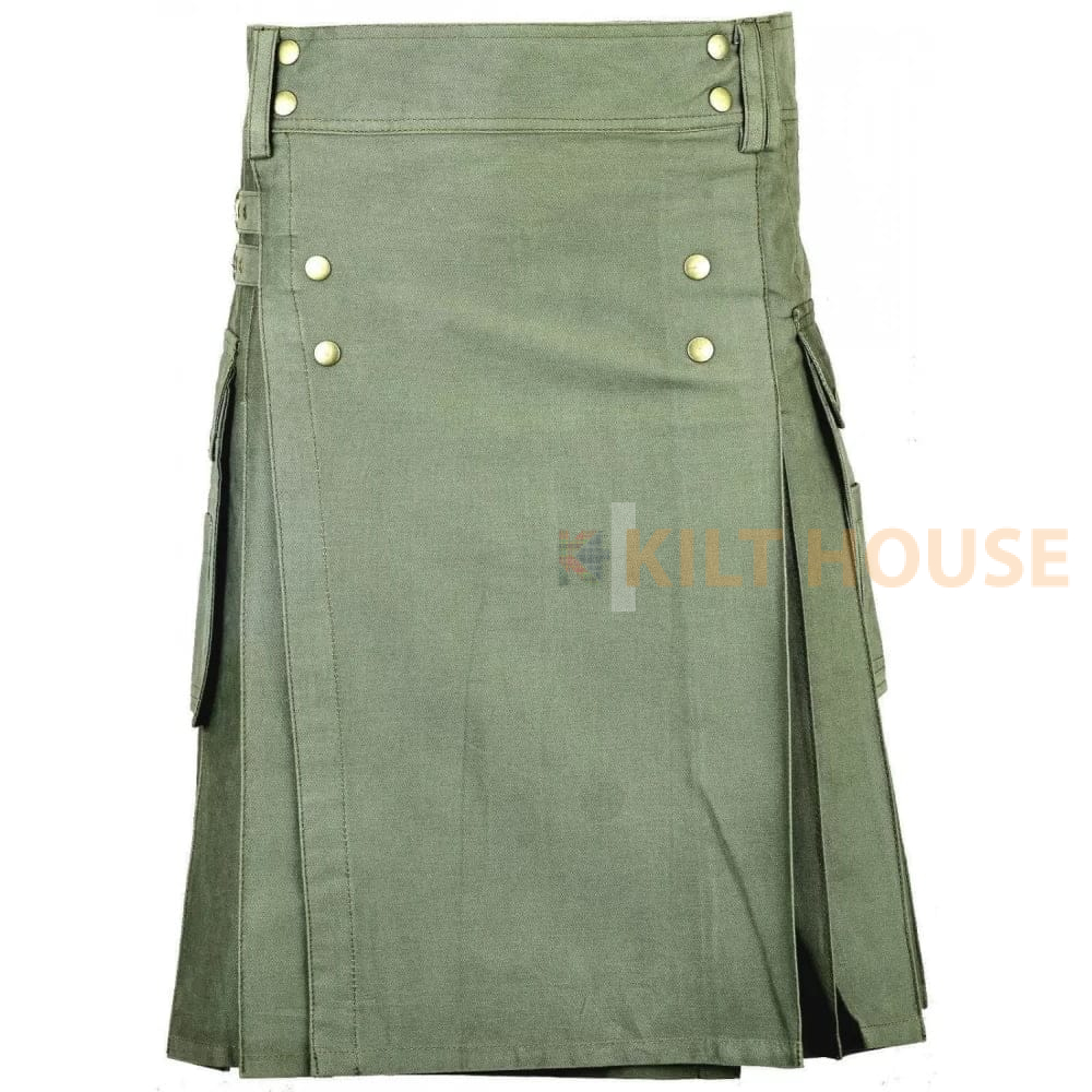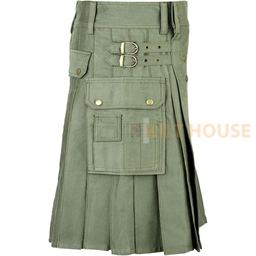 Men’s Olive Green Cotton Utility Kilt with front Buttons Comfort Meets Functionality