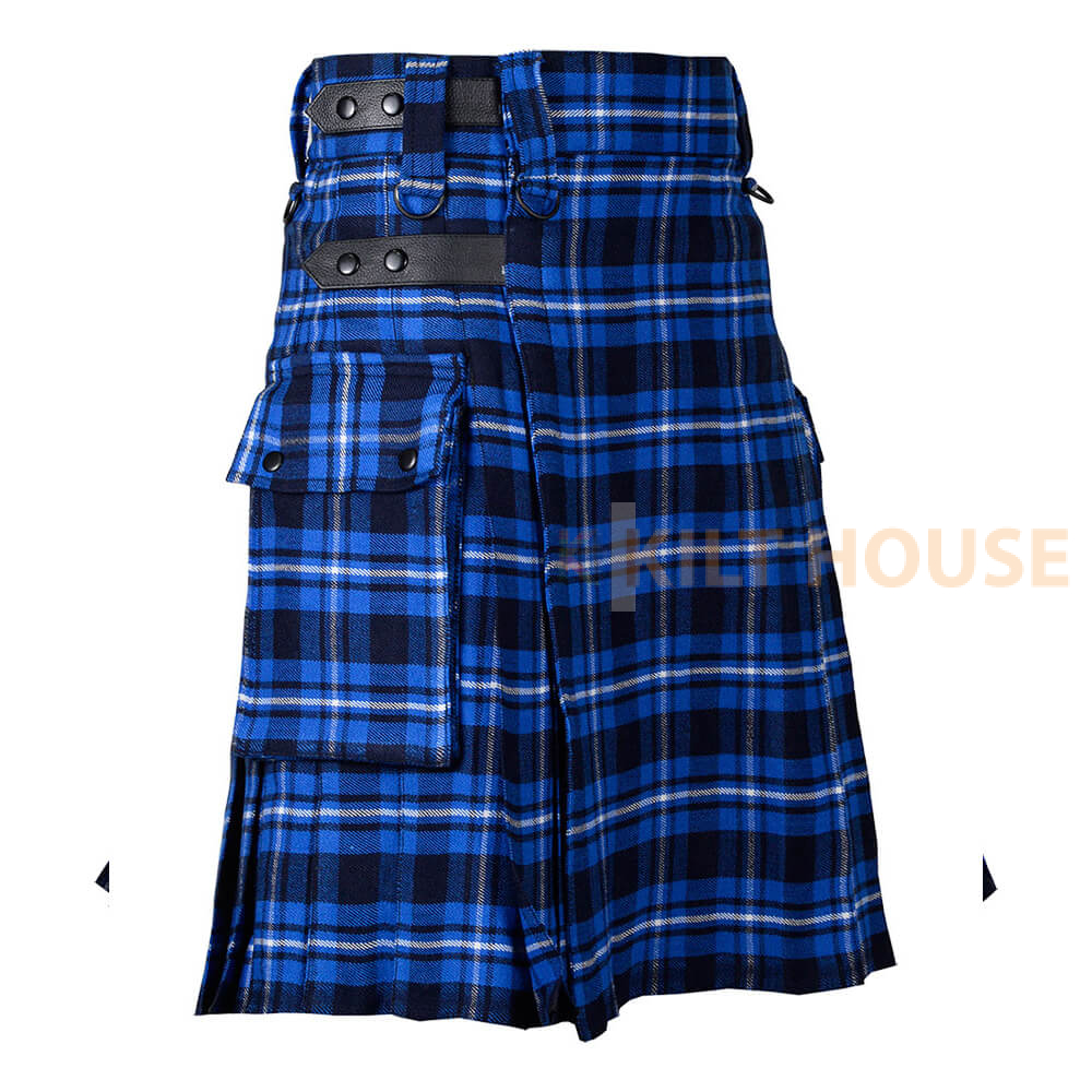 Introducing our Scottish modern utility kilt, a symbol of pride, tradition, and craftsmanship. The Scottish Ramsey Blue Tartan Kilt with modern utility features is a fashionable and functional choice for those who wish to embrace the rich Scottish heritage while enjoying the practicality of a contemporary garment. Whether for formal events, casual outings, or even everyday wear, this kilt provides a unique blend of tradition and modernity.