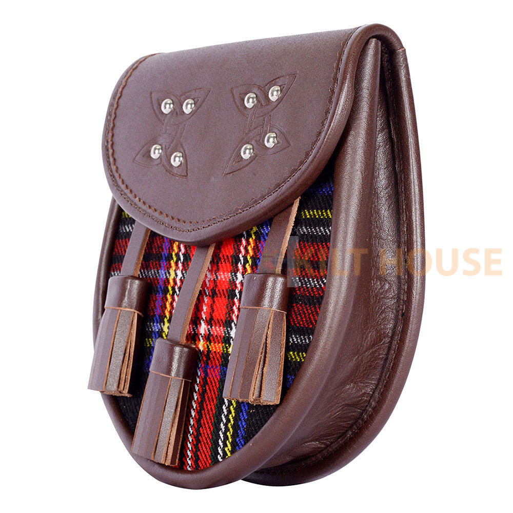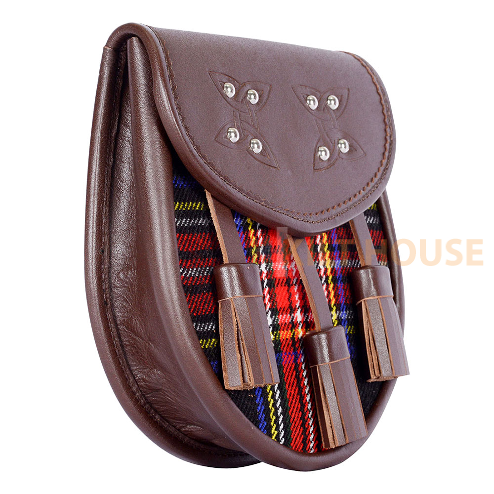 Scottish Sporran Black Stewart Tartan Brown Leather Made to Order offers clan pride and customization in a very budget conscious price tag. Your Family Tartan is pasted on the front of the sporran equipped with 3 matching leather tassels.