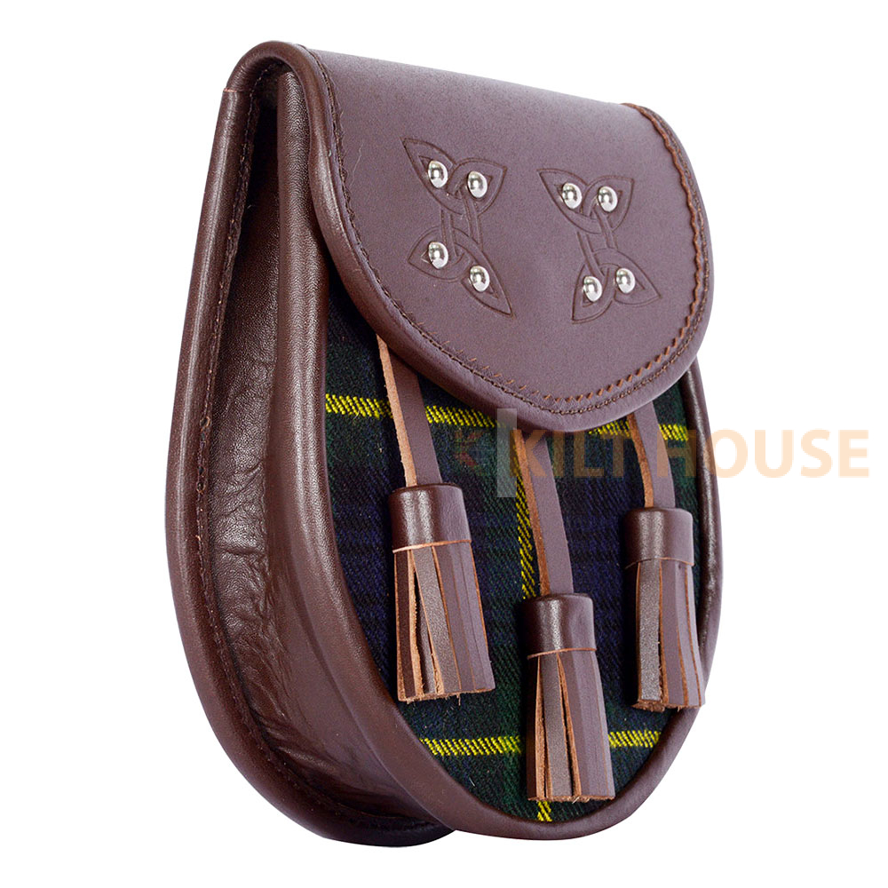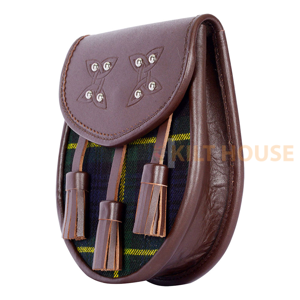 Scottish Sporran Gordon Tartan Brown Leather Made to Order offers clan pride and customization in a very budget conscious price tag. Your Family Tartan is pasted on the front of the sporran equipped with 3 matching leather tassels.