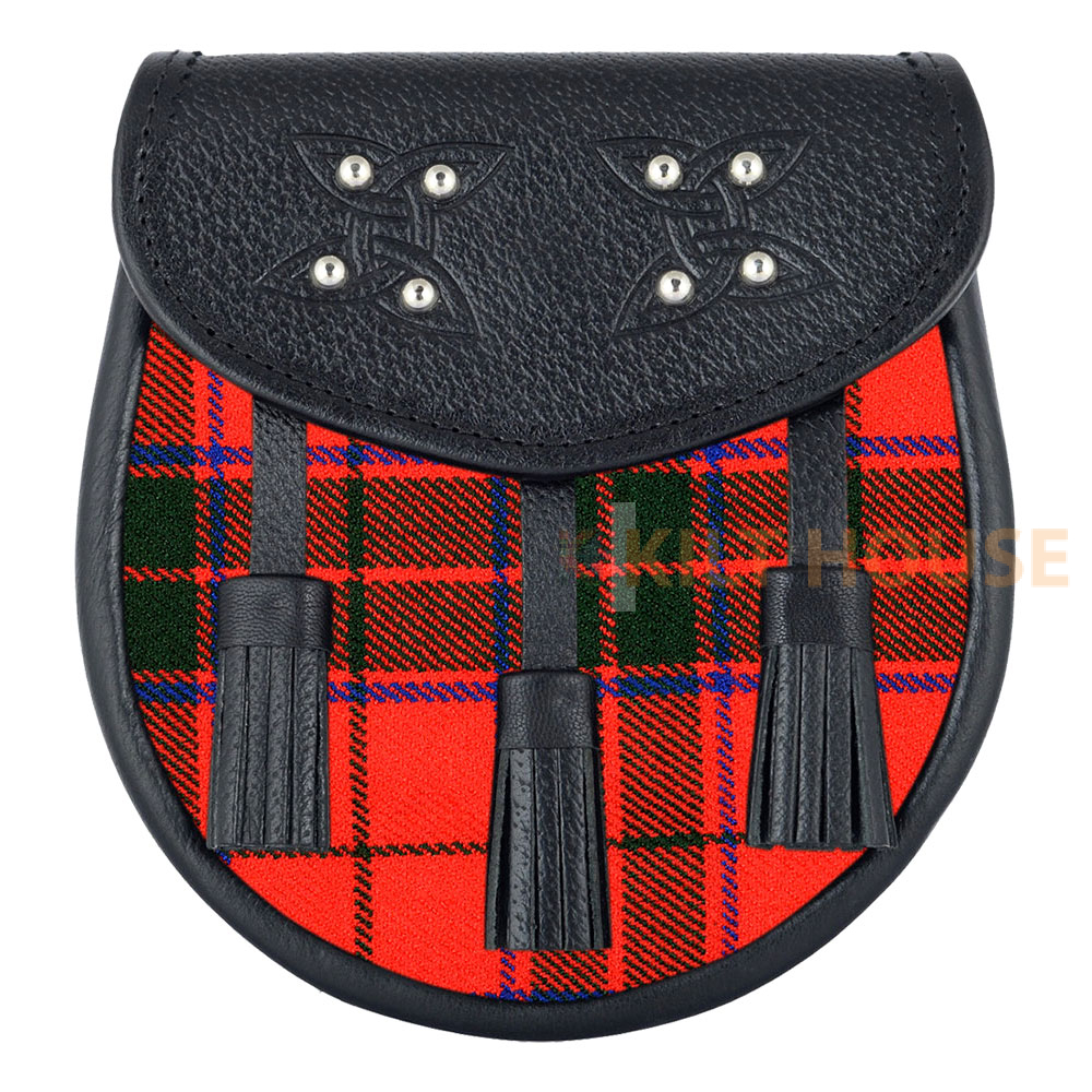 Scottish Sporran Scottish Rose Tartan Black Leather Made to Order and customization in a very budget conscious price tag. Your Family Tartan is pasted on the front of the sporran equipped with 3 matching leather tassels.