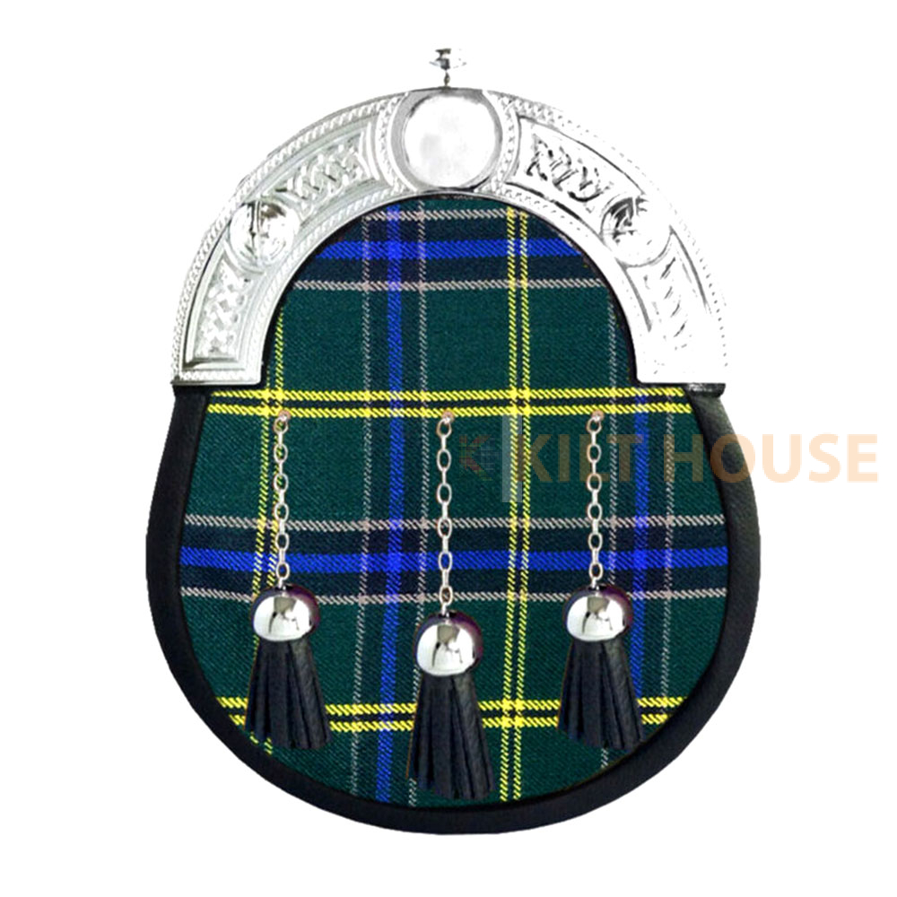 US Army Tartan Full Dress Leather Sporrans Introducing the Scottish Kilts Outfit Sporran, crafted from 100% genuine leather with a Celtic silver cantle and chain strap. This traditional Wallace Tartan kilt sporran bag embodies Scottish heritage and clan pride. The Black Watch Tartan Sporran is available in full-dress leather, featuring a customizable clan tartan on the front with three matching leather tassels. Made to order, this sporran combines premium-grade leather with a classic Scottish design, offering both value and durability. It’s an ideal accessory for both formal and informal events, perfect for those seeking quality and affordability.